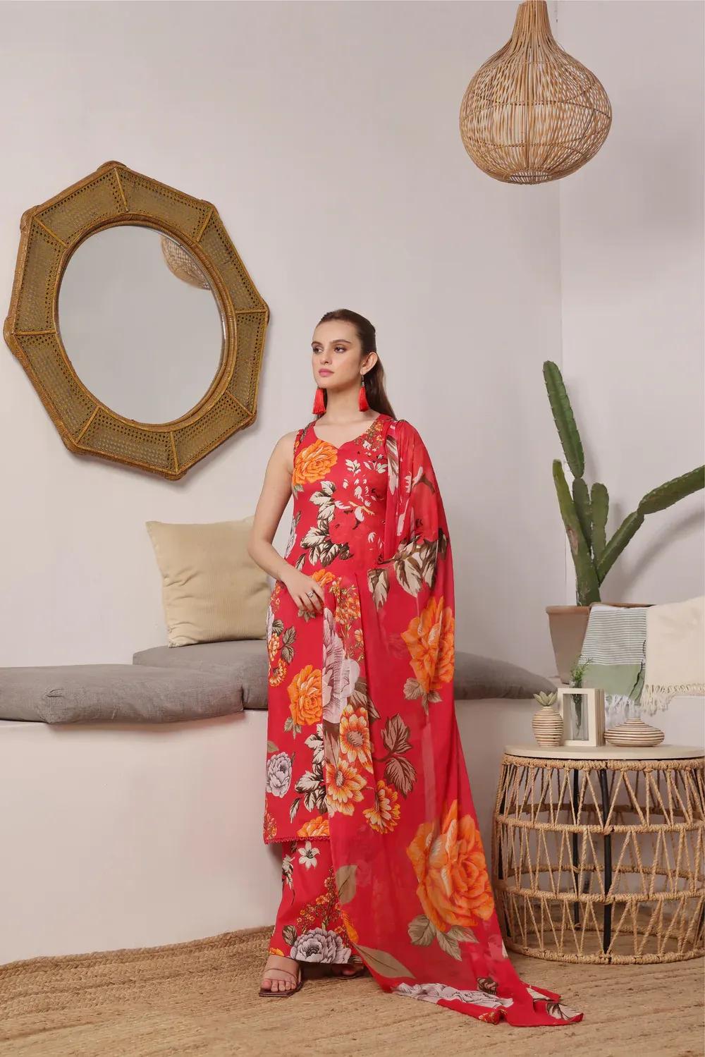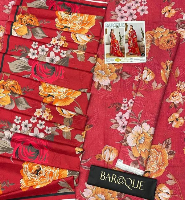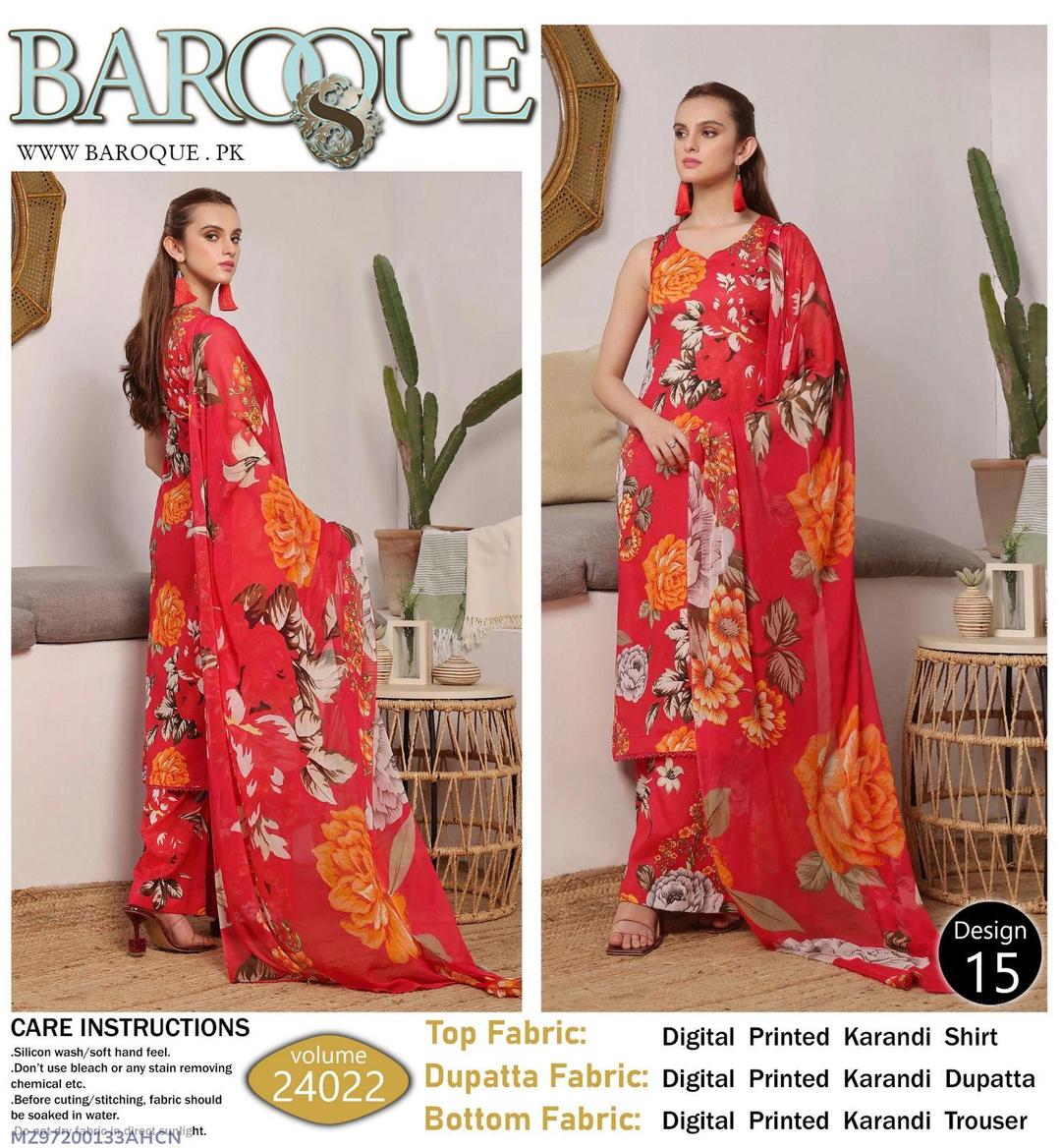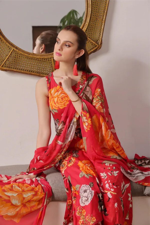This 3-piece red Karandi set features digital prints on the shirt, trouser, and dupatta. Includes 2.5 meters for the shirt and 2.5 yards each for the trouser and dupatta. Measurements may vary slightly, and colors may differ due to lighting.